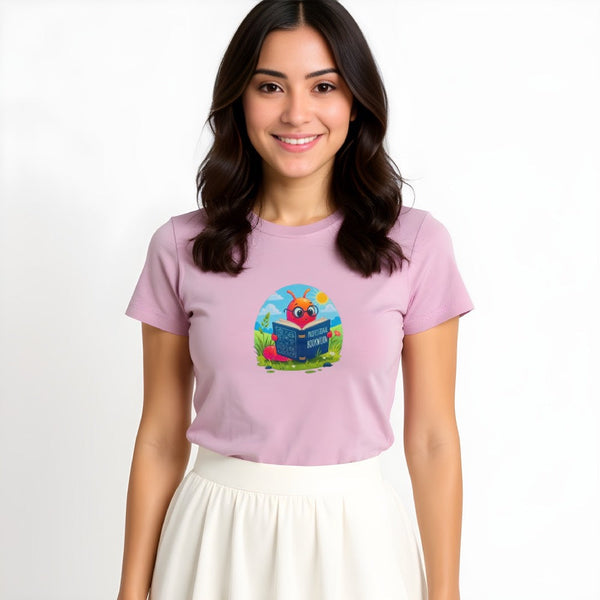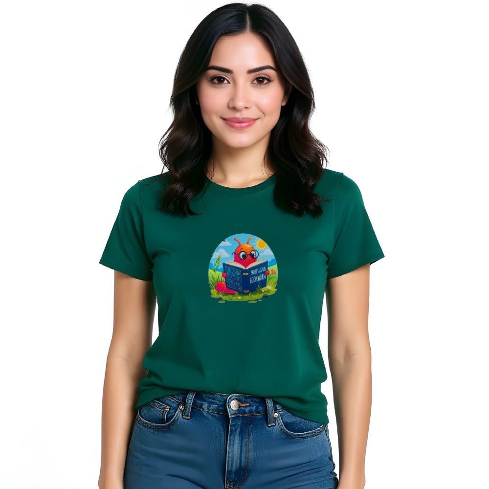 Product Description and Fit: A classic crew neck t-shirt with short sleeves with vibrant print of a book-worm. The garment fits true to size and offers a relaxed, comfortable fit.